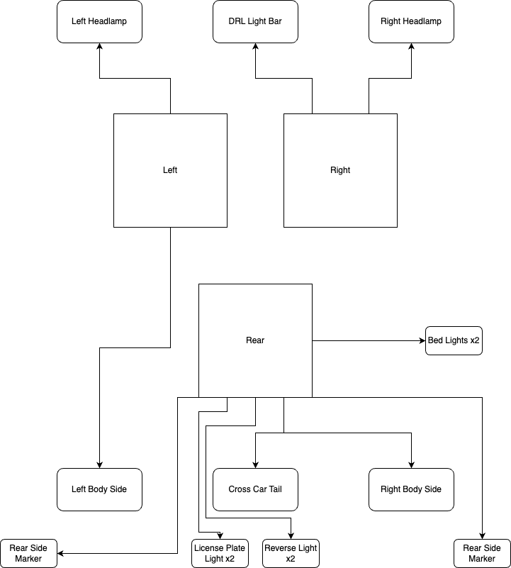 The exterior lighting system control is distributed between the vehicle controllers as depicted in the diagram below. The front headlamps have their own ECU and are receiving signals from the vehicle controllers over LIN bus. The rear lights consist of the body and tailgate, stop lights, and the license plate lights. They are directly managed by the left and rear vehicle controllers using Universal Asynchronous Receiver-Transmitter (UART) over the Controller Area Network (CAN).