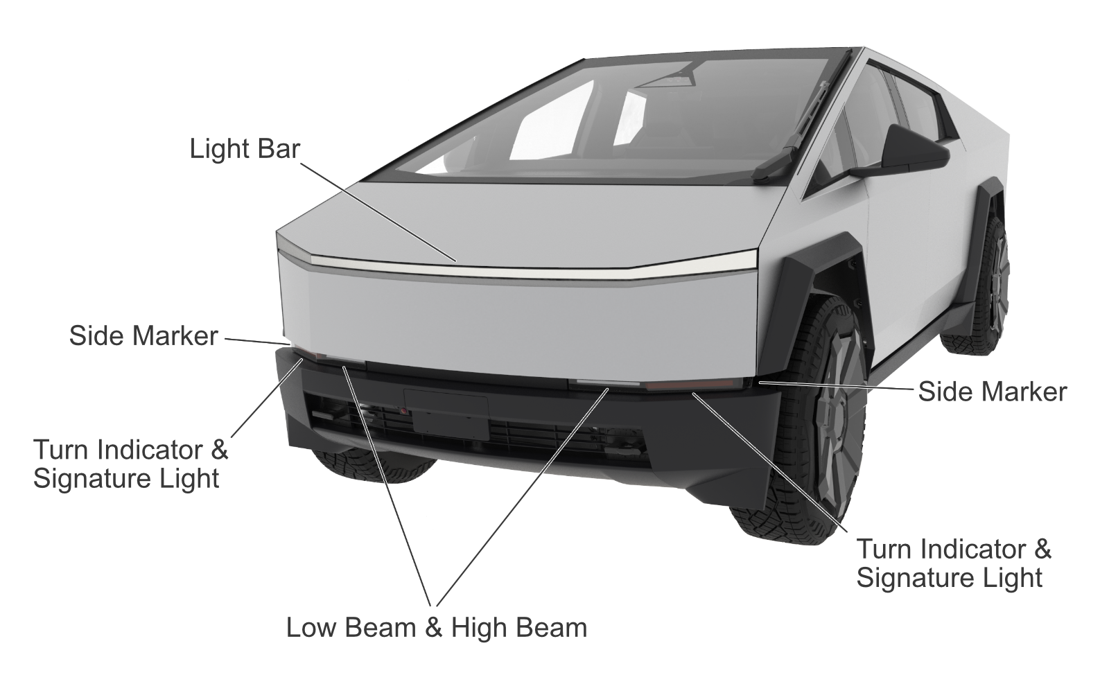 Cybertruck headlamps have an LED light source that is controlled by the headlamp control module (HCM) that is managed via local interconnect network (LIN) by two body controllers, VCLEFT for the left headlamp assembly and VCRIGHT for the right side. The left LIN bus is shared with the wiper controller. The headlight assembly consists of multiple LEDs that collectively form the low beam or high beam. The right side is shared between the amber turn light and a white signature light strip that is illuminated while the low beams are active and the turn light is off.