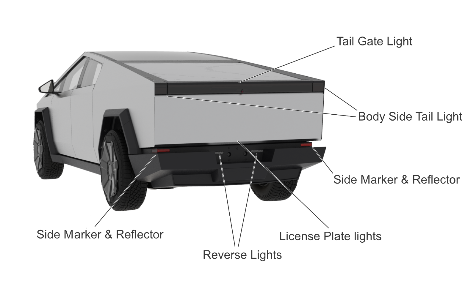 The exterior lights on Cybertruck are all LED components. Power and operation of the lights is controlled by the three vehicle controllers (VCREAR, VCLEFT, VCRIGHT). As with other Mid-Voltage components in Cybertruck, the exterior lights utilize electronic fuses incorporated into the vehicle controllers.