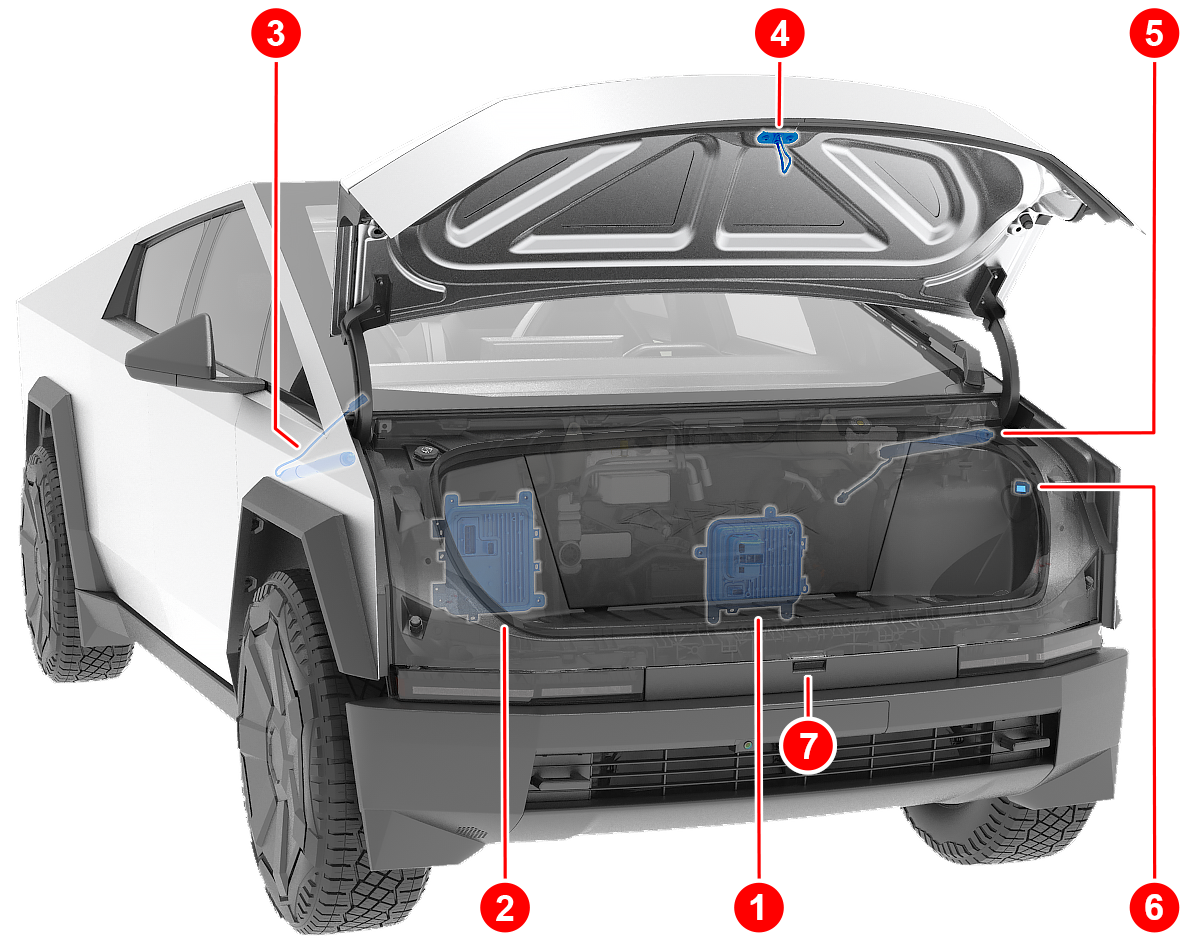 The front trunk can be released through the frunk access post in case of vehicle power loss. For additional information, refer to the Shutdown and Recovery document.
