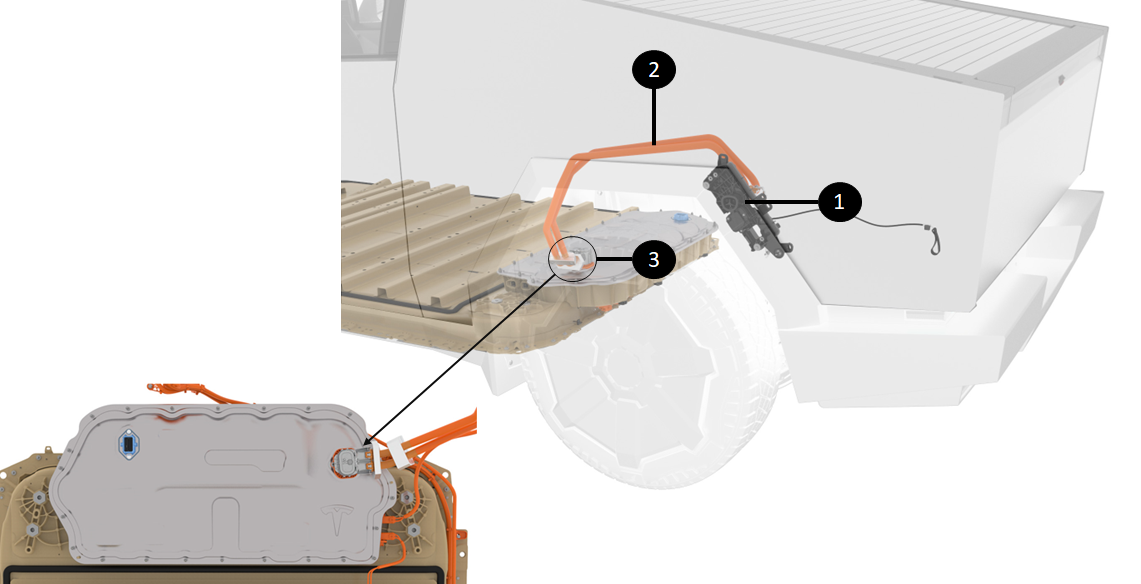 | 1. Charge port 2. Charge port harness to HV battery 3. HV battery inlet charge port busbar connector CP-HV-AT-HVBATT |