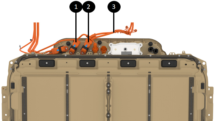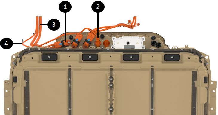 | 1. Front drive unit HV cable connection at HV battery 2. Compressor HV cable connection at HV battery 3. Front drive unit HV cable 4. Compressor HV cable |