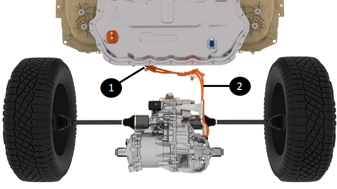 | 1. Rear Drive Unit HV connection underneath ancillary bay - RDU-HV-AT-HVBATT 2. Rear Drive Unit HV cable |