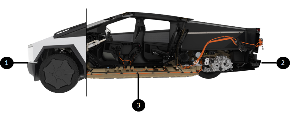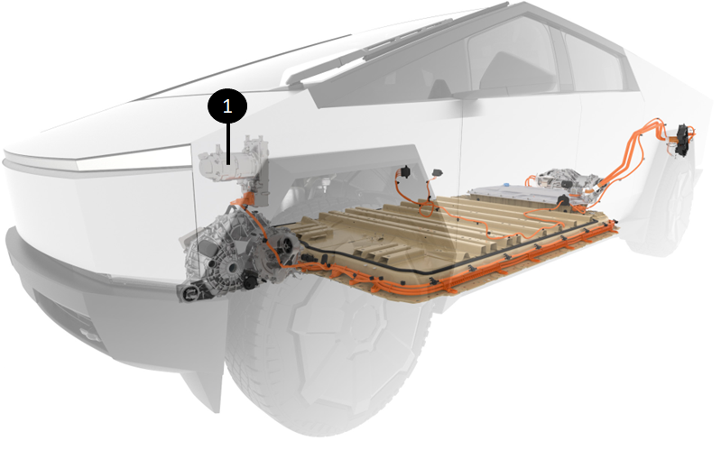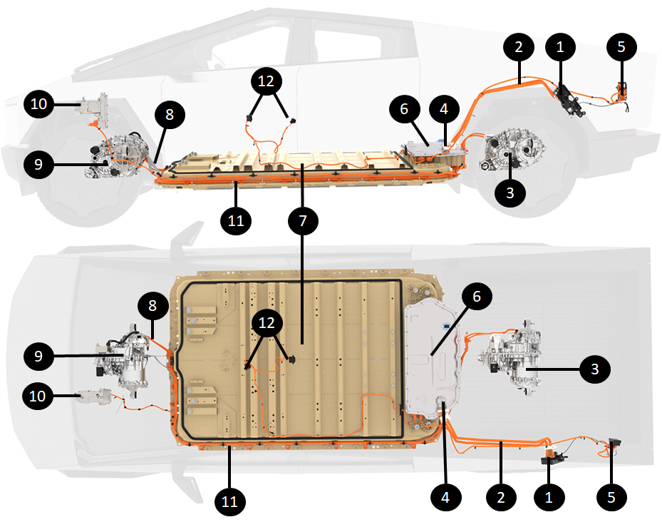 | 1. Charge port 2. Charge port busbars 3. Rear drive unit 4. HV battery inlet charge port busbar connector 5. Truck bed AC outlet 6. Ancillary Bay 7. Structural High voltage battery 8. HV cable to Front Drive Unit 9. Front Drive Unit 10. Heat Pump Compressor 11. Routing of Front Drive Unit and Compressor from Rear of HV battery to Front of vehicle 12. Cabin AC outlets |