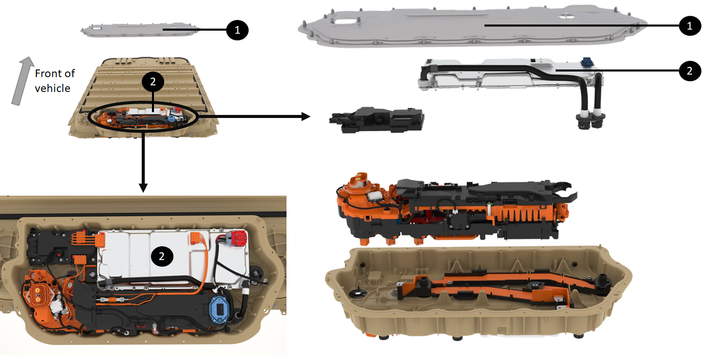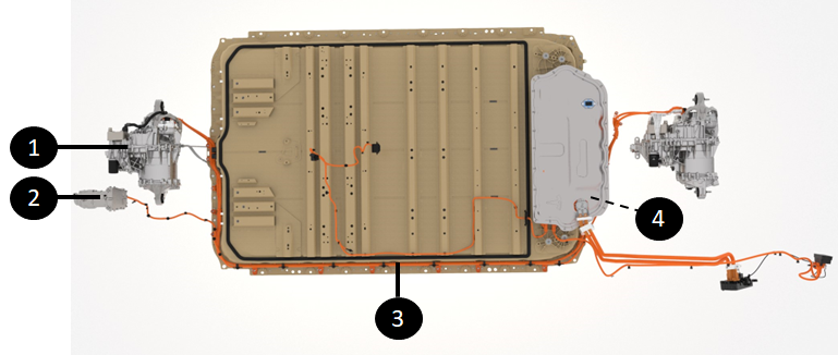 | 1. Front drive unit 2. Compressor 3. Compressor and front drive unit HV cables running along the HV battery 4. Compressor and front drive unit HV connections at back of HV battery, under the ancillary bay |