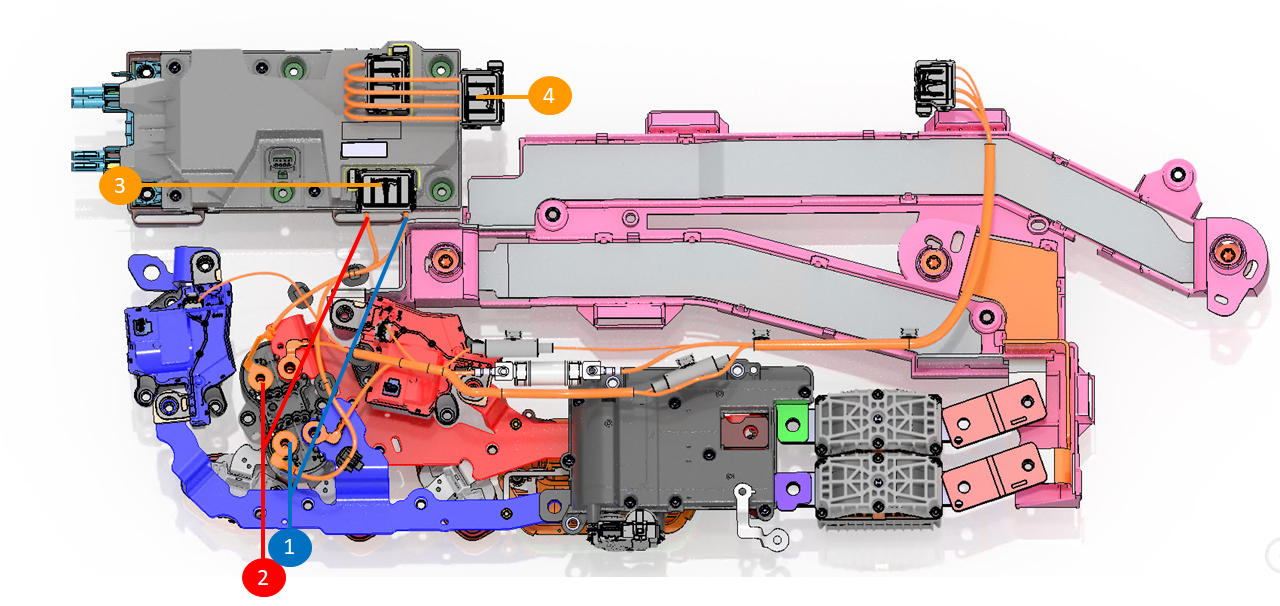 | 1. Rear Left Drive Unit HV cable connection at HV battery RDUL-HV-AT-HVBATT (shown in Dual Motor with a dummy plug) 2. Rear Right Drive Unit HV cable connection at HV battery RDUR-HV-AT-HVBATT 4. Rear Right drive unit HV cable |