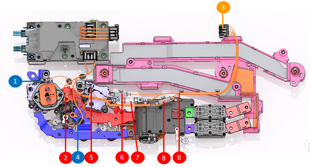 | 1. Always powered negative connection on negative contactor for always on DCDC 2. Lug connection at FC contactor for DC Link positive HV to PCS 3. HV connector to PCS 4. Lug connection for DC Link positive HV to PCS 5. Always powered positive connection on positive contactor for always on DCDC 6. Sand fuse integrated in harness for always ON DCDC 7. Sand fuse integrated in harness for PCS2 8. Second Sand fuse integrated in harness for always on DCDC |