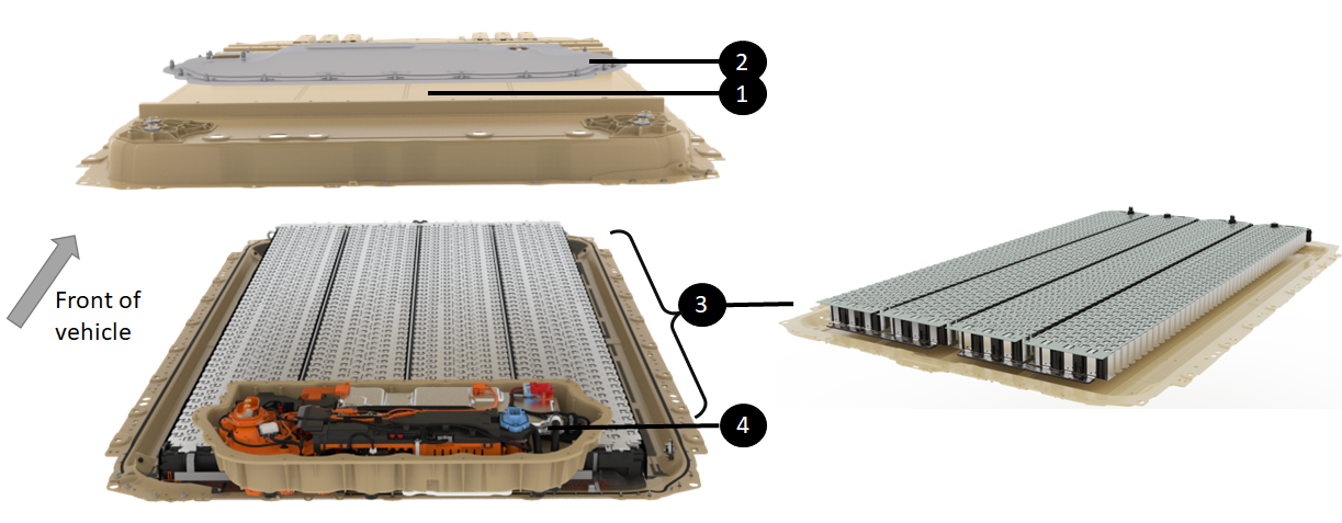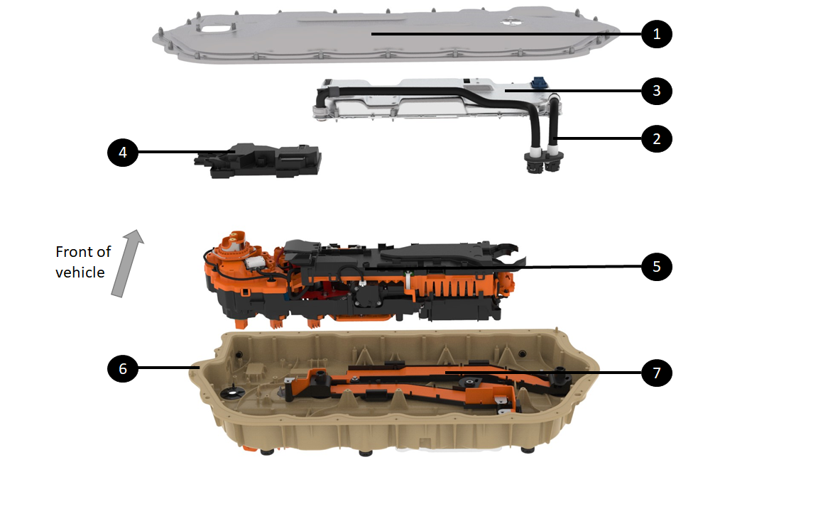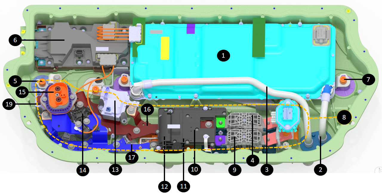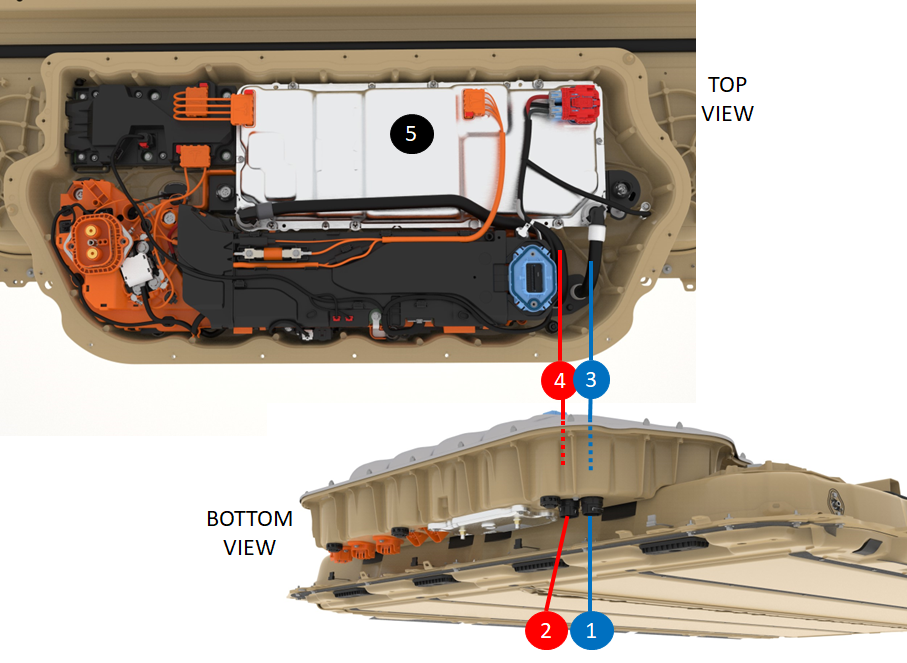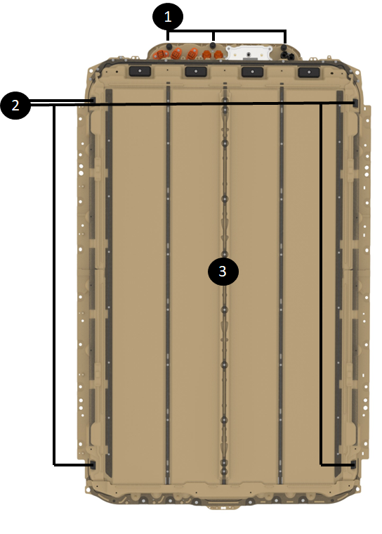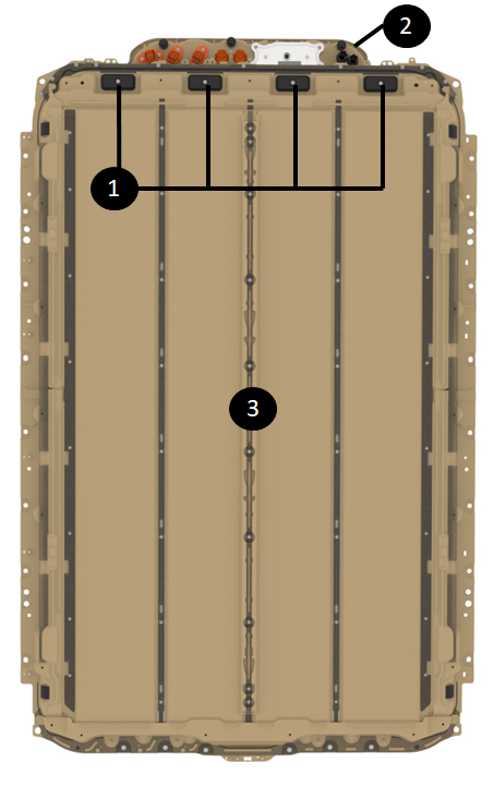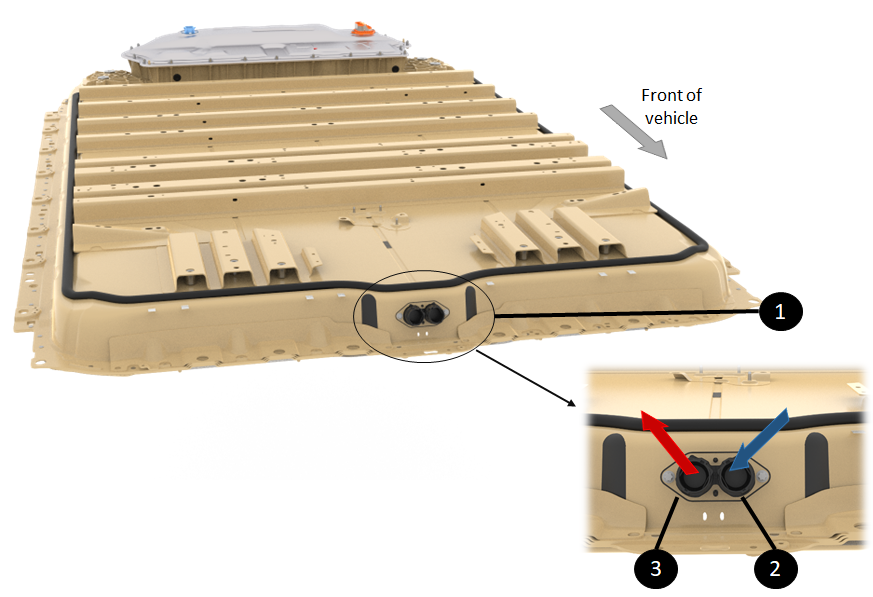 | 1. Coolant ports for the platter 2. Coolant inlet into the HV battery 3. Coolant outlet outside of the HV battery |