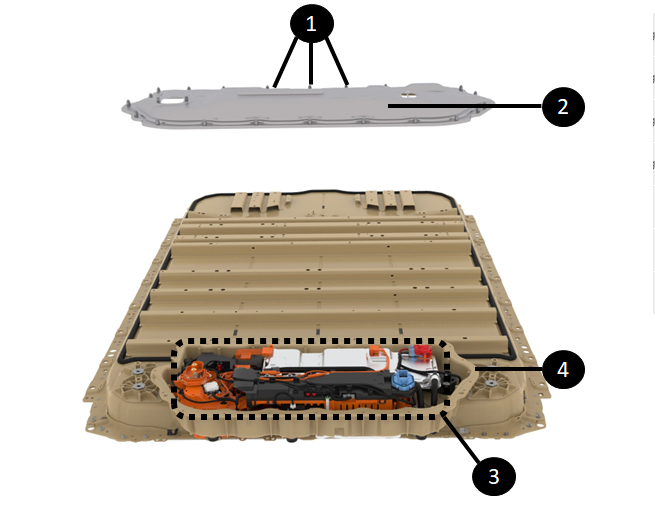 | 1. Ancillary Bay Fasteners 2. Ancillary Bay Service Cover 3. HV Components in Ancillary Bay 4. Seal / Gasket of the Ancillary Bay |