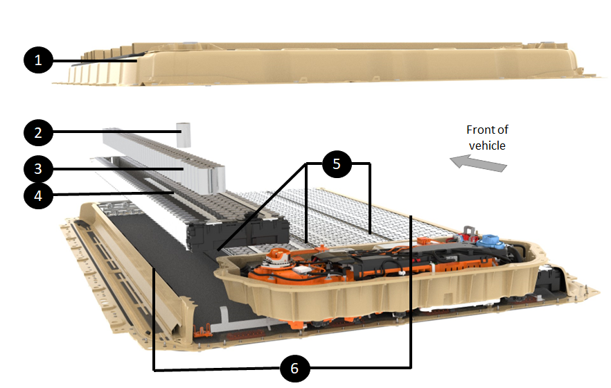 | 1. Four vent assemblies at the rear of the HV battery 2. Ancillary Bay 3. Vent section that disintegrates with heat 4. Cover which pops off with pressure 5. Breather |