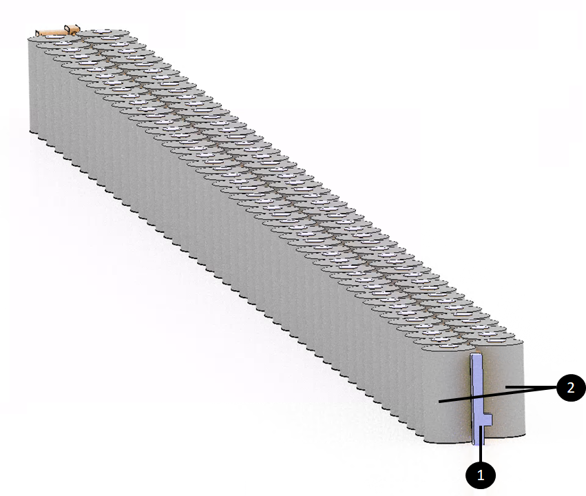 In the cell-arrays, each cell has about a third of its surface in contact with a cooling tube. The entire height of any cell contacts the cooling tube to ensure homogenous temperature along the cell.