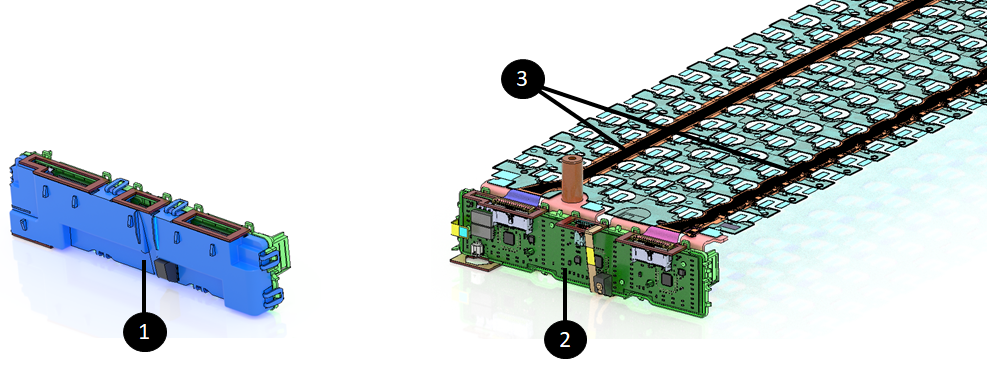 | 1. BMB Unit 2. BMB PCBA (plastic housing removed) 3. Voltage Sense Harness (VSH) |