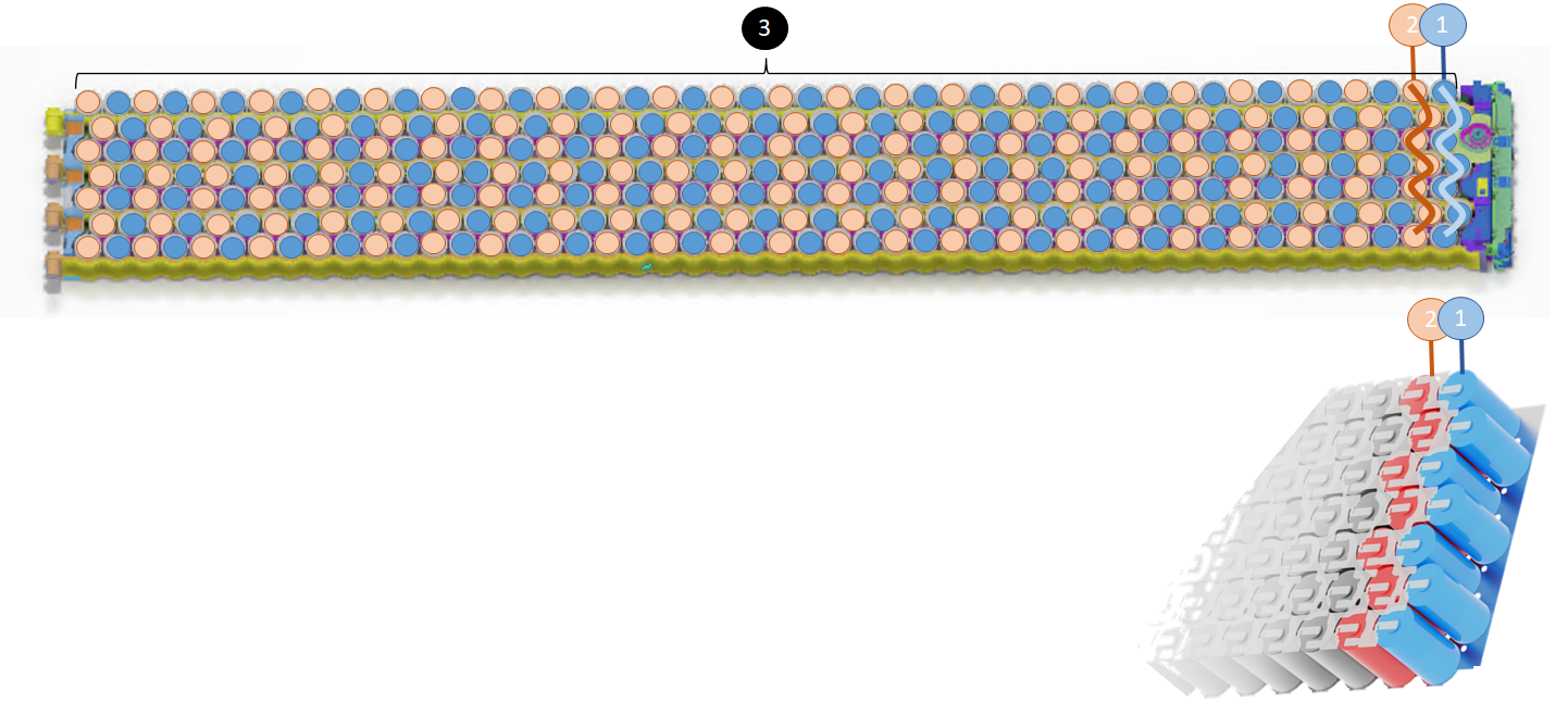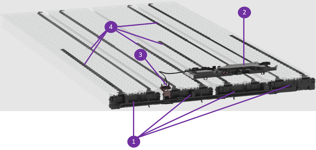 | 1. BMBs at End of Each Cell-Array 2. HVC 3. Passthrough Connector Between Ancillary Bay Platter 4. Voltage Sense Harnesses (VSH) |