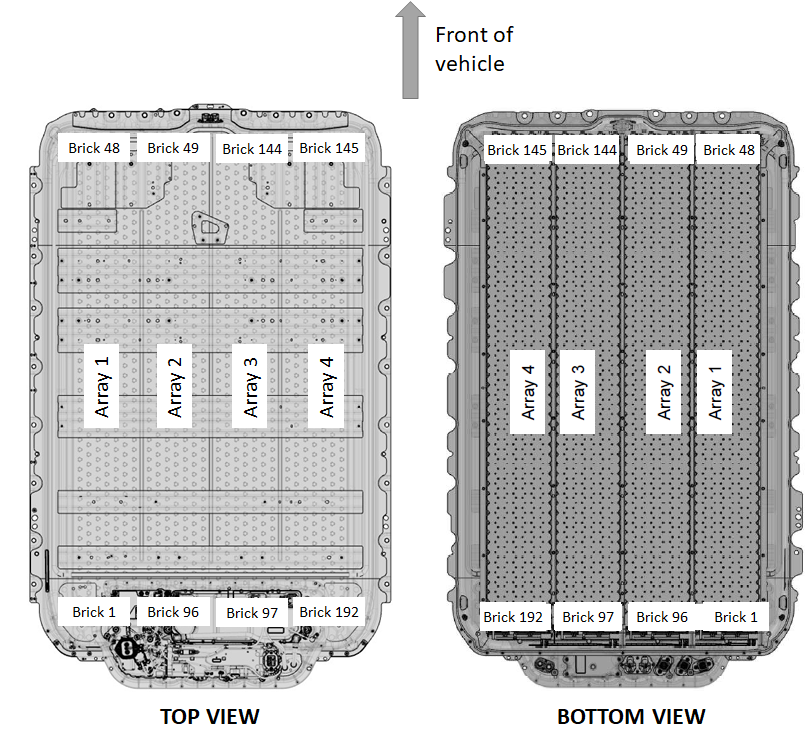 The HV battery is made of 4 independent cell-arrays installed length wise in the platter. The cell-array contains the cells of the HV battery and it is the source of energy and power for the vehicle. Each cell-arraycell-array