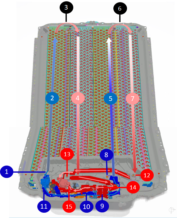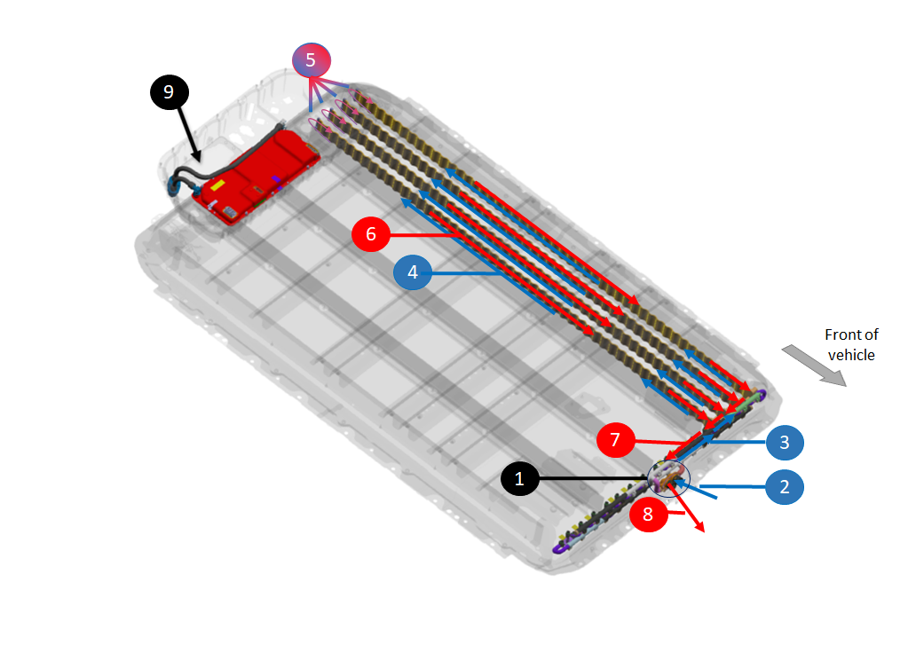 | 1. Coolant passthrough from and to vehicle coolant loop 2. Coolant inlet to the HV battery 3. Coolant entering HV battery though the inlet manifold 4. Coolant flows through the bottom section of the cooling tube to the rear of the cell-array 5. Coolant makes a U turn in the cooling tube to end up in top section of the tube 6. Coolant flows through the top section of the cooling tube back to the front of the cell-array and HV battery 7. Coolant flows through the top section of the cooling tube back to the front of the cell-array and HV battery 8. Coolant going to passthrough from cooling tube via the outlet manifold 9. PCS 2 coolant loop |