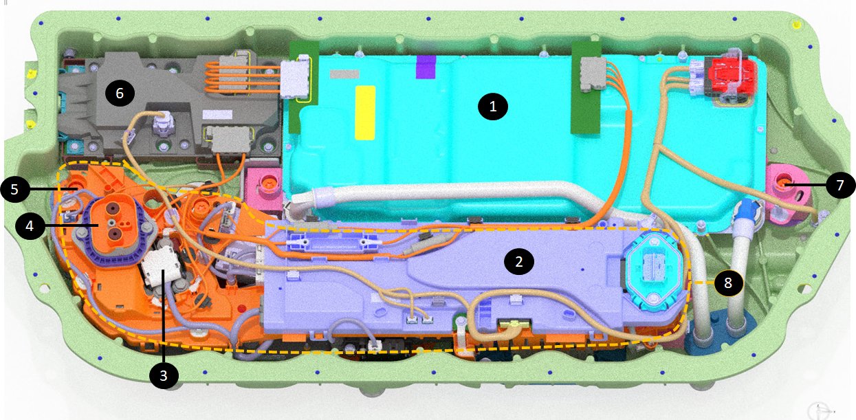 | 1. PCS2 2. High Voltage Controller (part of the device cluster) 3. Fast Charge contactor assembly 4. Charge inlet 5. Most Negative cell-array terminal (Cell-Array 1) 6. AC junction box 7. Most positive cell-array terminal (Cell-Array 4) 8. Device Cluster |