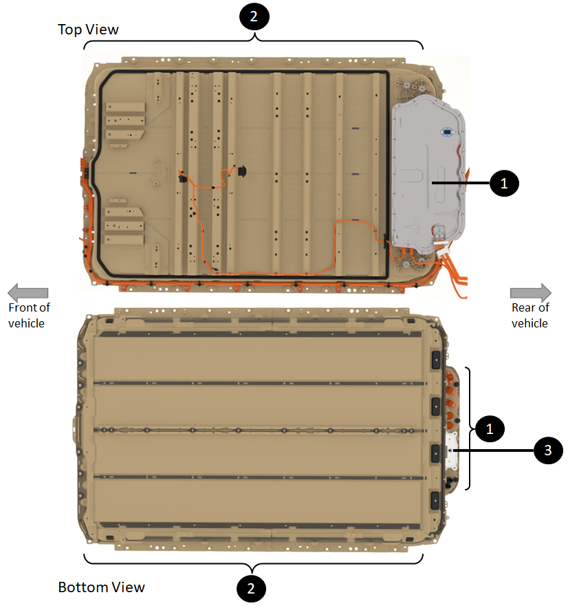 | 1. Front of vehicle 2. Rear of vehicle 3. HV Battery |