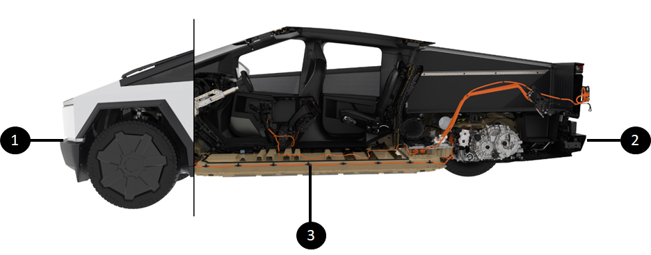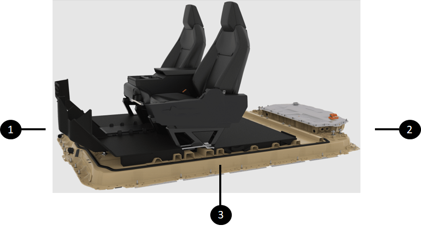 | 1. Ancillary Bay 2. HV battery Platter 3. Pyro-Disconnect Cover |
