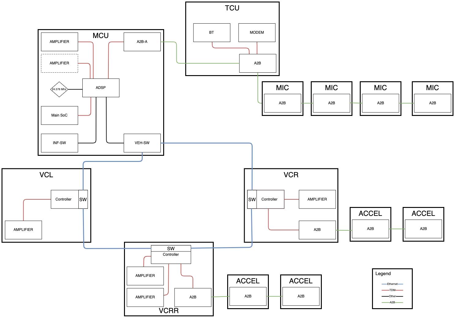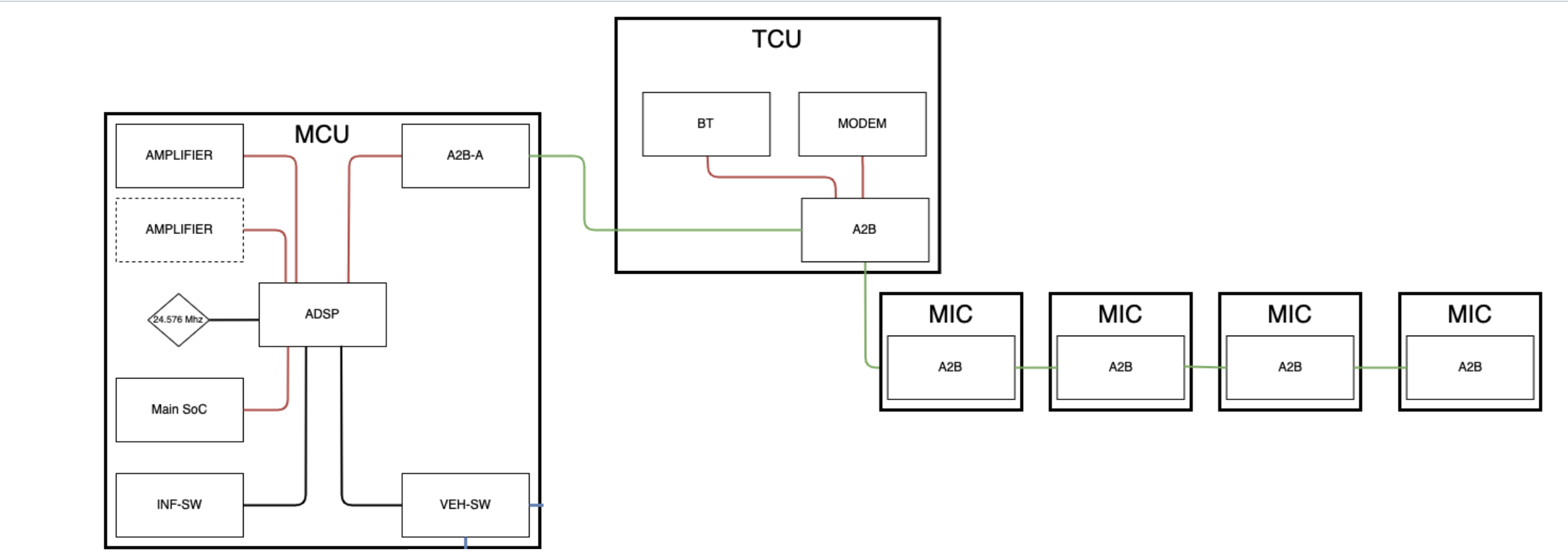 - Connects the ADSP, TCU, front seat microphones, and A-Pillars' microphones in a daisy chain.