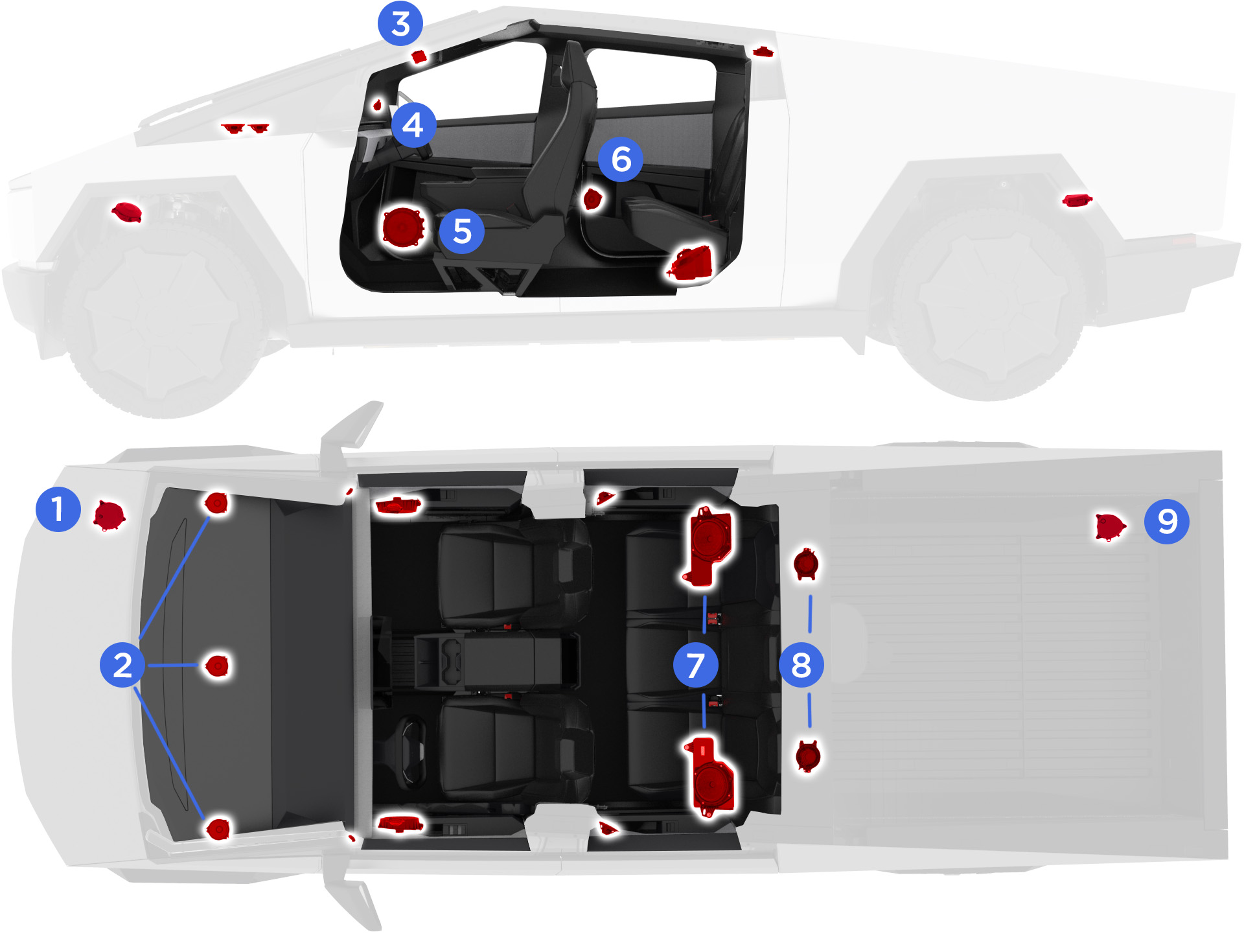 Cybertruck contains two headliner microphones and two seat microphones. The two headliner microphones are used for Telephony (calls and voice commands).