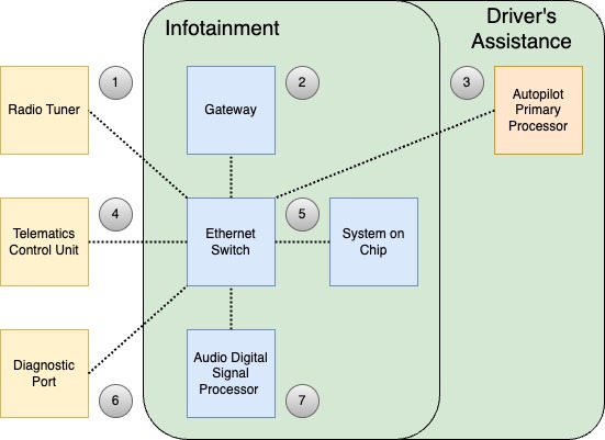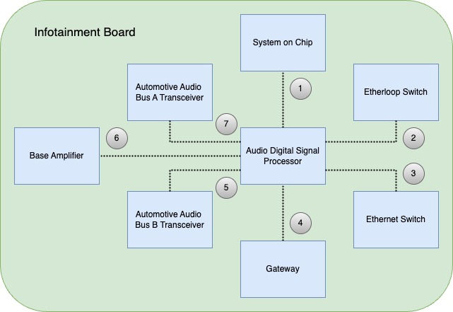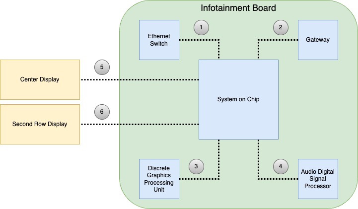 The purpose of the Infotainment Ethernet Switch is to provide a communication path between the Diagnostics Port, System on Chip, Gateway, Tesla Connectivity Unit, audio Digital Signal Processor, Driver's Assistance ECU, and Rail Tuner.