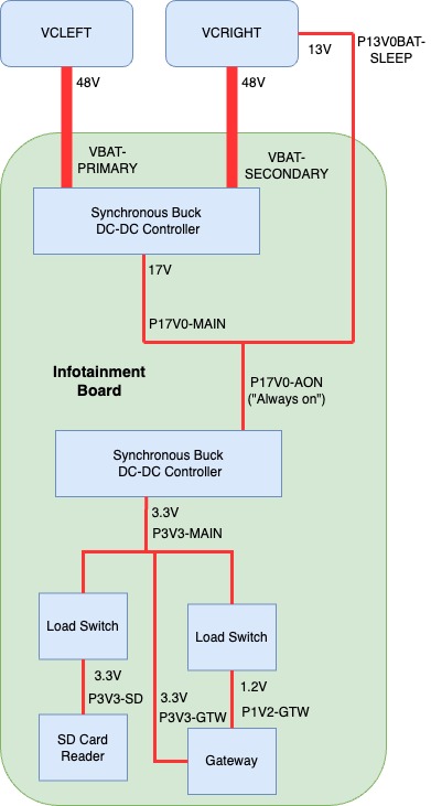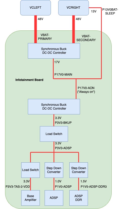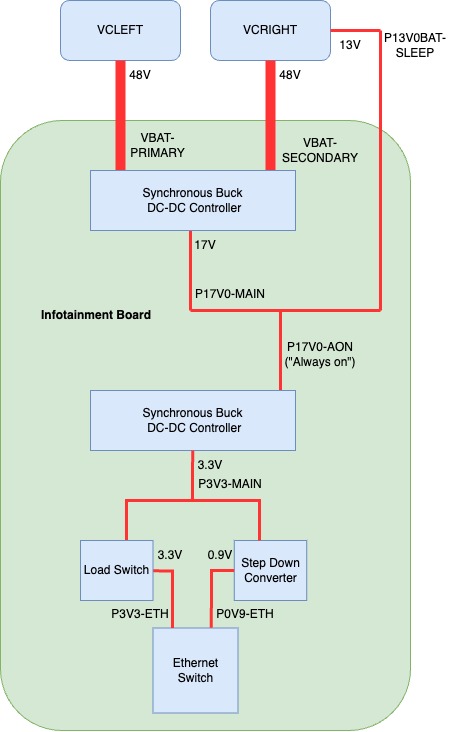 Constant power is provided to the Infotainment board by two 48V parallel sources: the VCLEFT and VCRIGHT. This voltage is then stepped down to an "always on" 17V rail (P17V0-AON), which powers up the Gateway.