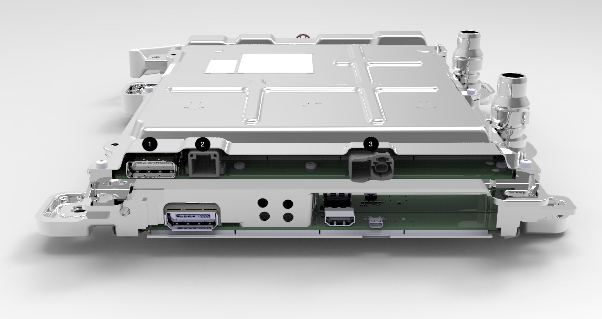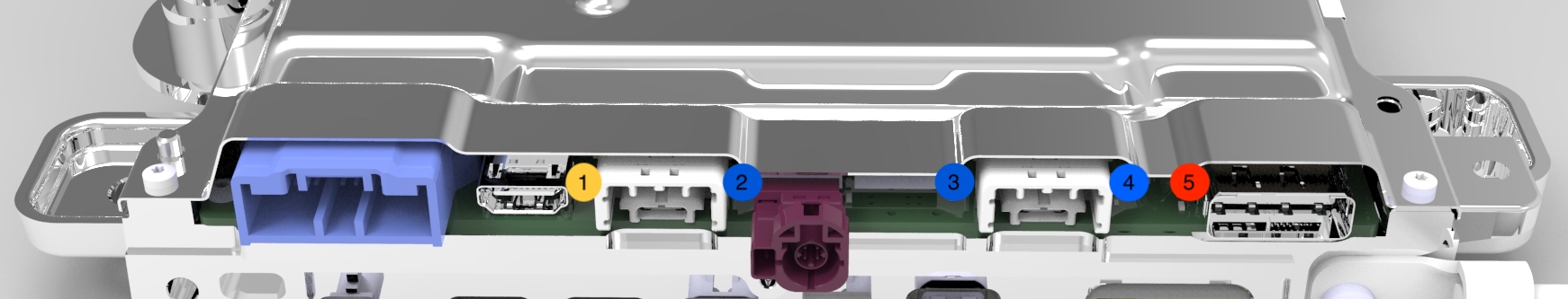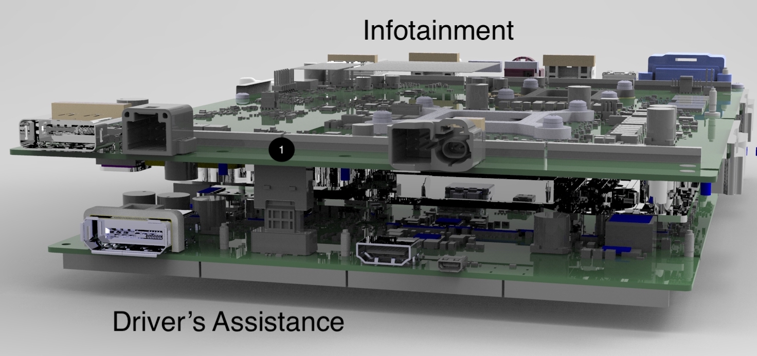 There are several new connectors on the Infotainment board, including the Signal & Power Universal Device Connector (SPUD), the Automotive grade USB-C connector as well as the Driver's Assistance Board to Board Connector.