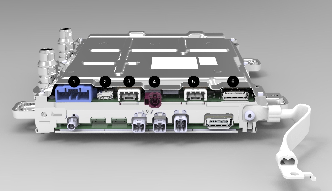 | 1. Diagnostic Ethernet / Ethersnoop / Onboard Diagnostic & Restraint Control Module CAN / Sleep Bypass Voltage 2. Debug (Not Connected to Vehicle Harness) 3. Glove Box USB 4. Rear Display Power / Ground / Communication 5. Center Display Power / Ground / Communication 6. Vehicle Controller Right Power / Etherloop |