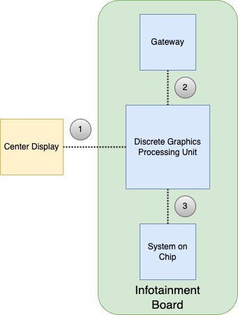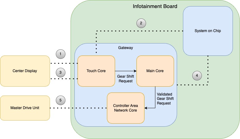 The gateway, a critical part of the vehicle's operating system, is a microcontroller with three CPUs and substantial memory resources. It contains two 160MHz 32-bit CPUs, one 80MHz 32-bit CPU, 6 MB of flash memory, and 768 KB of RAM. It is the backbone of the infotainment system and beyond and is responsible for routing the CAN data that allows various parts of the vehicle to communicate with each other.