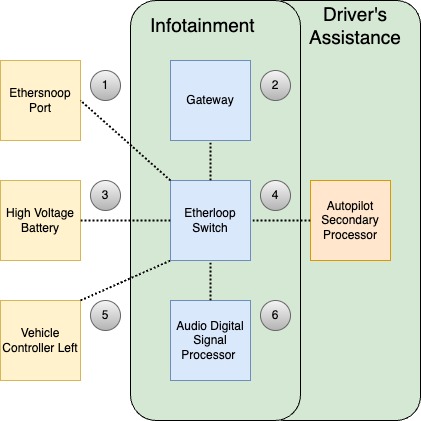 The Etherloop communicates with the Vehicle Controller Left (VCLEFT) and the Autopilot Secondary Processor (APS) using 1000B-T1, and communicates with the Ethersnoop using 100B-TX and the High Voltage Battery using 100B-T1. Communication with the Audio Digital Signal Processor and the Gateway are realized by separate Serial Gigabit Media Independent Interface (SGMII) connections.