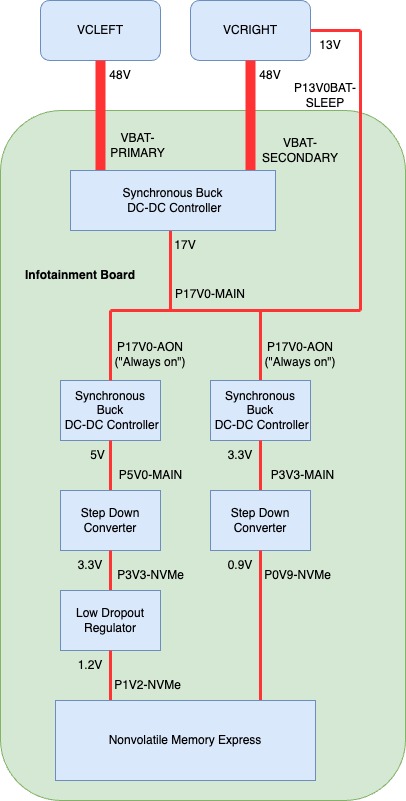 Power - Nonvolatile Memory Express power originates from VCRIGHT (VBAT-SECONDARY) or VCLEFT (VBAT-PRIMARY), both operating at 48V. This voltage is subsequently reduced to 17V by a DC/DC controller energizing the P17V0-MAIN power rail. This main 17V power rail then merges with the 13V sleep bypass voltage (P13V0BAT-SLEEP), resulting in the 17V "Always On" power rail (P17V0-AON).