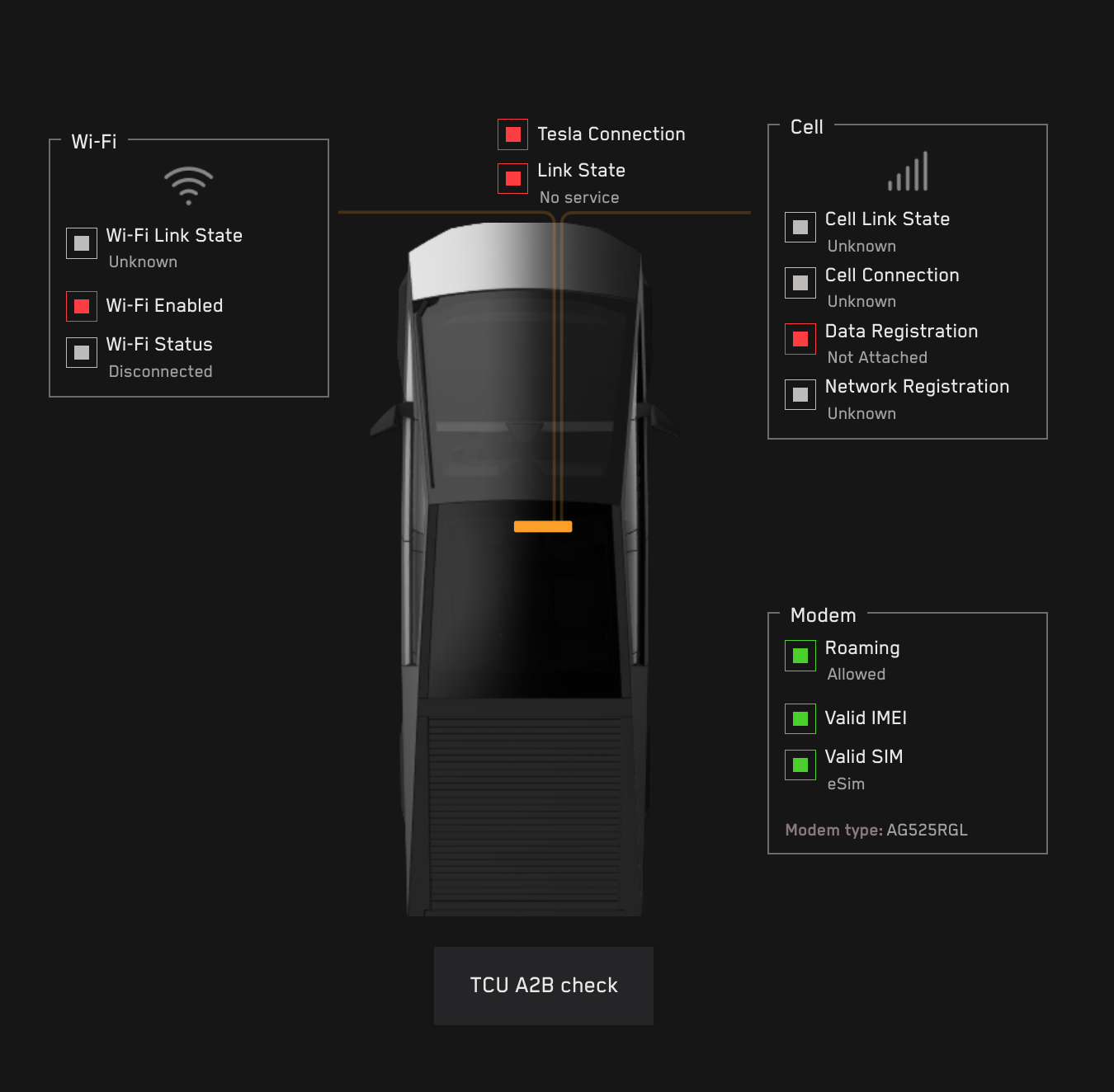 | Service Mode Connectivity Panel shows the TCU is not connected to Tesla network when its power supply is off |
