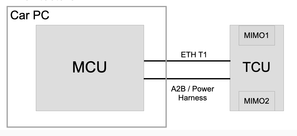 The TCU contains an Automotive LTE module, a Wi-Fi and Bluetooth module, an Ethernet Physical Layer (PHY) chip and an A2B transceiver. It is powered by the Media Control Unit (MCU) through the A2B harness. TCU is also connected to the infotainment computer through an Ethernet harness which carries all the data over Ethernet protocol. The harness is used for the data traffic between the Infotainment main board and the Cellular module, Wi-Fi, and Bluetooth module. The LTE and Wi-Fi antennas are located within the TCU.