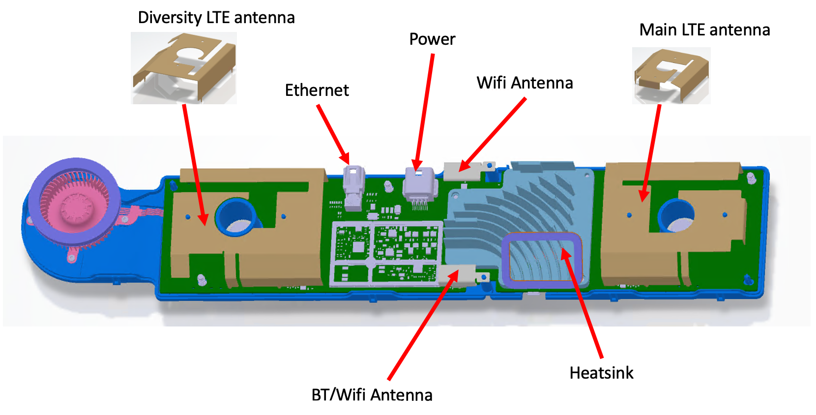 - Cast Aluminum heat sink is used for LTE Cellular module and Wi-Fi and Bluetooth module.