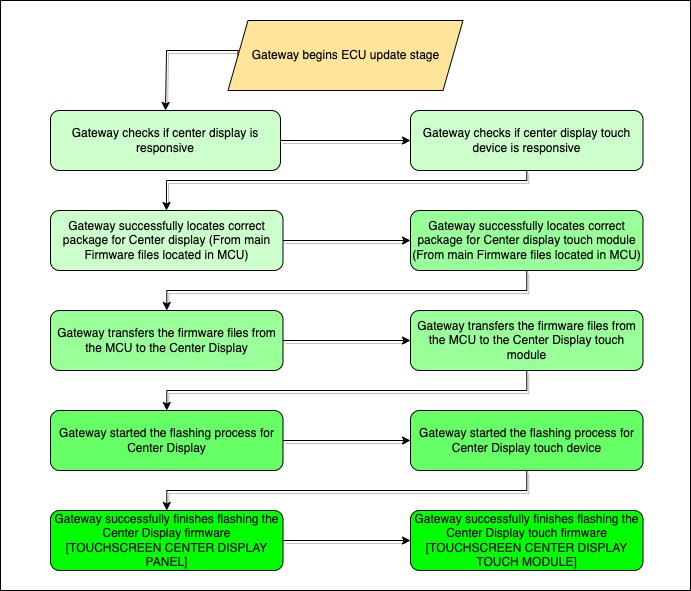 - During a firmware update, the center display and its touch device module are treated as their own unique components by the Gateway and are updated in the same sequence as all other Electronic Control Units (ECUs) the gateway is responsible for. The Gateway uses i2c protocol to flash both components. The component naming convention during the update is 'TOUCHSCREEN CENTER DISPLAY PANEL' and 'TOUCHSCREEN CENTER DISPLAY TOUCH MODULE' respectively.