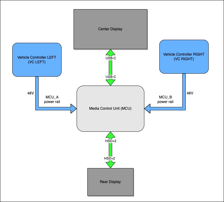 - The MCU will continue to supply power to the center display as long as the Left Vehicle controller or Right vehicle controller power to MCU is present.