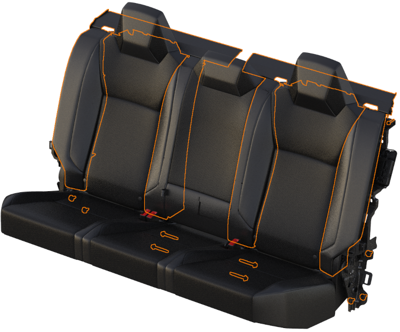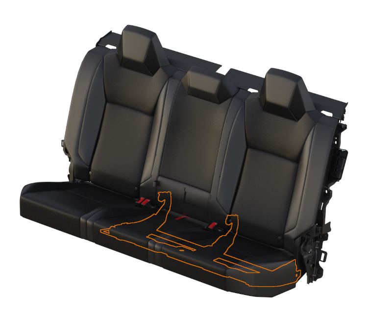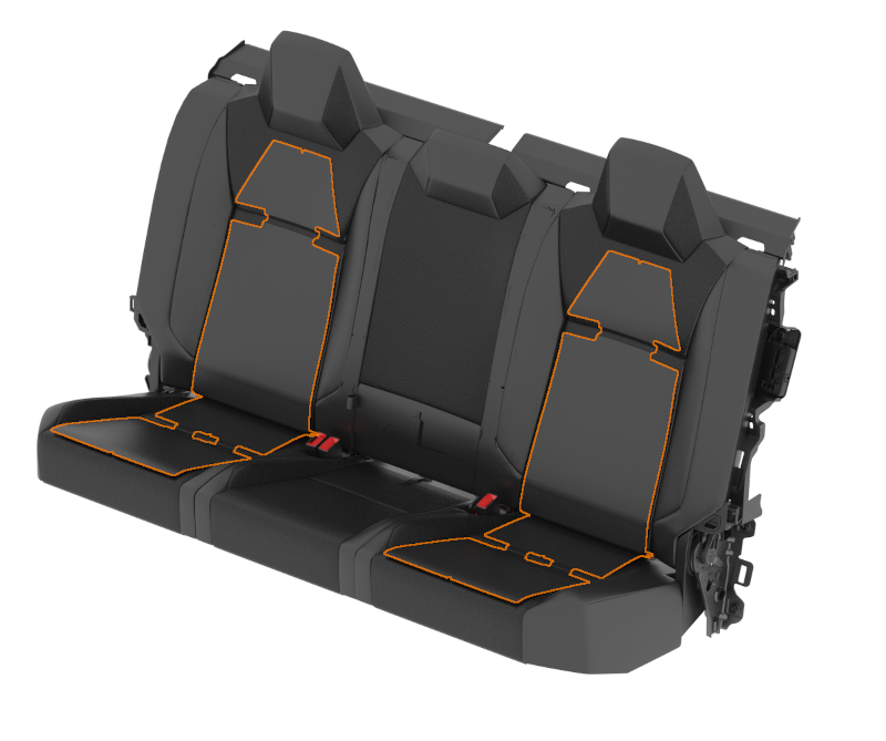 Cybertruck second-row seat covers are secured to the foam using a smart clip that attaches within the foam trenches. Once the foam is sandwiched by the cover, it is connected to the upholstery support or pan, ensuring the seat cushion retains its shape before being affixed to the seat frame. Additionally, there is stitch detailing within the seat to aid in shaping it around the foam. A metal seat frame then provides support to the cushion prior to attaching the outermost panel, which is referred to as the underbelly.