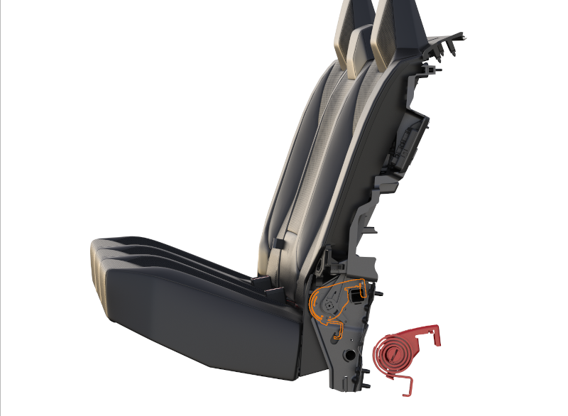 Within the recliner mechanism is a clock spring that aids in kicking the cushion up to get it from the use position to the stowed position. This spring is only a lift assist to provide assistance in stowing the cushion; the user must push the cushion the rest of the way to lock it into place.