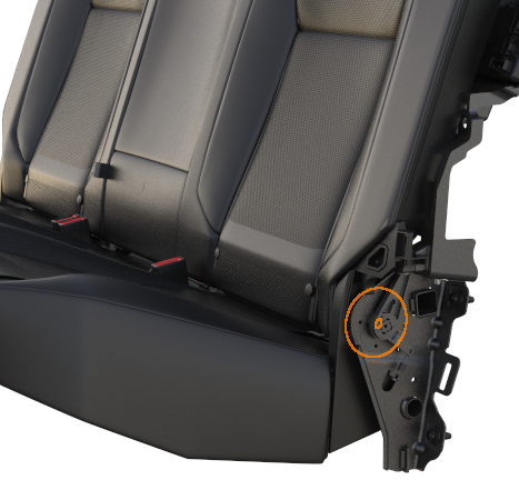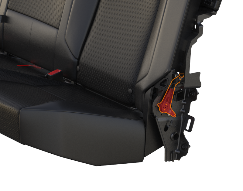 The second-row cushion can be stowed in the upright position in order to give more storage in the second row. When in the use position, the cushion sits atop the rear wall lower stantons that are covered by the rear wall lower carpet.