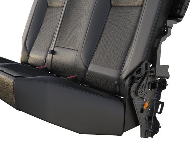 There are two positions that the second-row seat cushion can be locked into, the cushion folded up or the cushion deployed in use position. A recliner mechanism is welded on both outboard sides of the frame, between the main seatback frame and the cushion frame in order to allow for this feature.