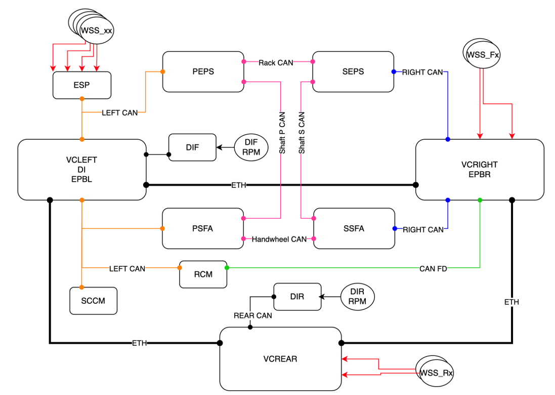 There are 6 main Controller Area Network (CAN) buses used by the Steer-by-Wire (SbW) system during normal operation (there are several more internal Buses that will not be covered in theory of operation, the focus should be on learning these below):