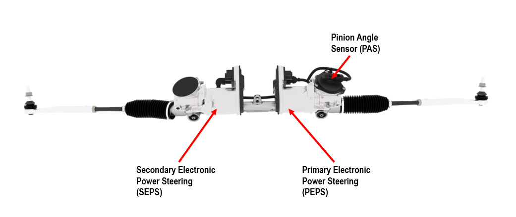 There is a steering rack pinion angle sensor (PAS) mounted onto the primary steering actuator gearbox. The sensor measures rack position and reports directly to PEPS via SENT communication.