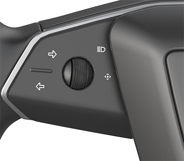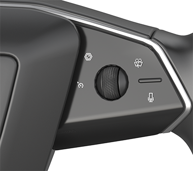 The right switches control the camera views, windshield wipers, voice commands and right scroll wheel button (for Autopilot features). There is also the cruise control indicator.