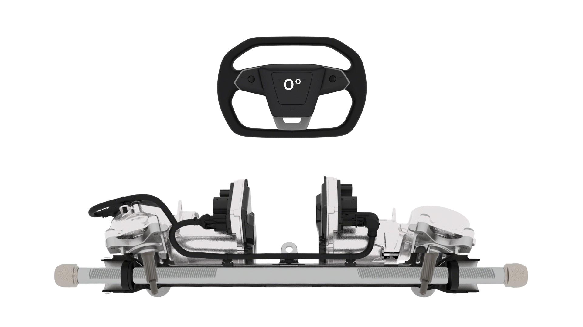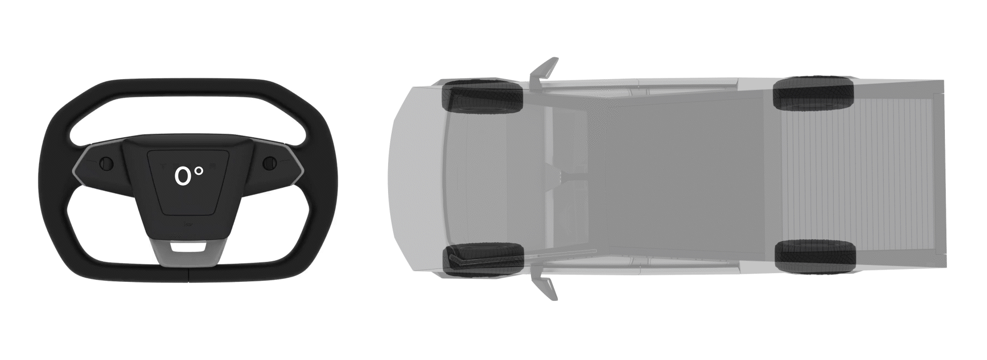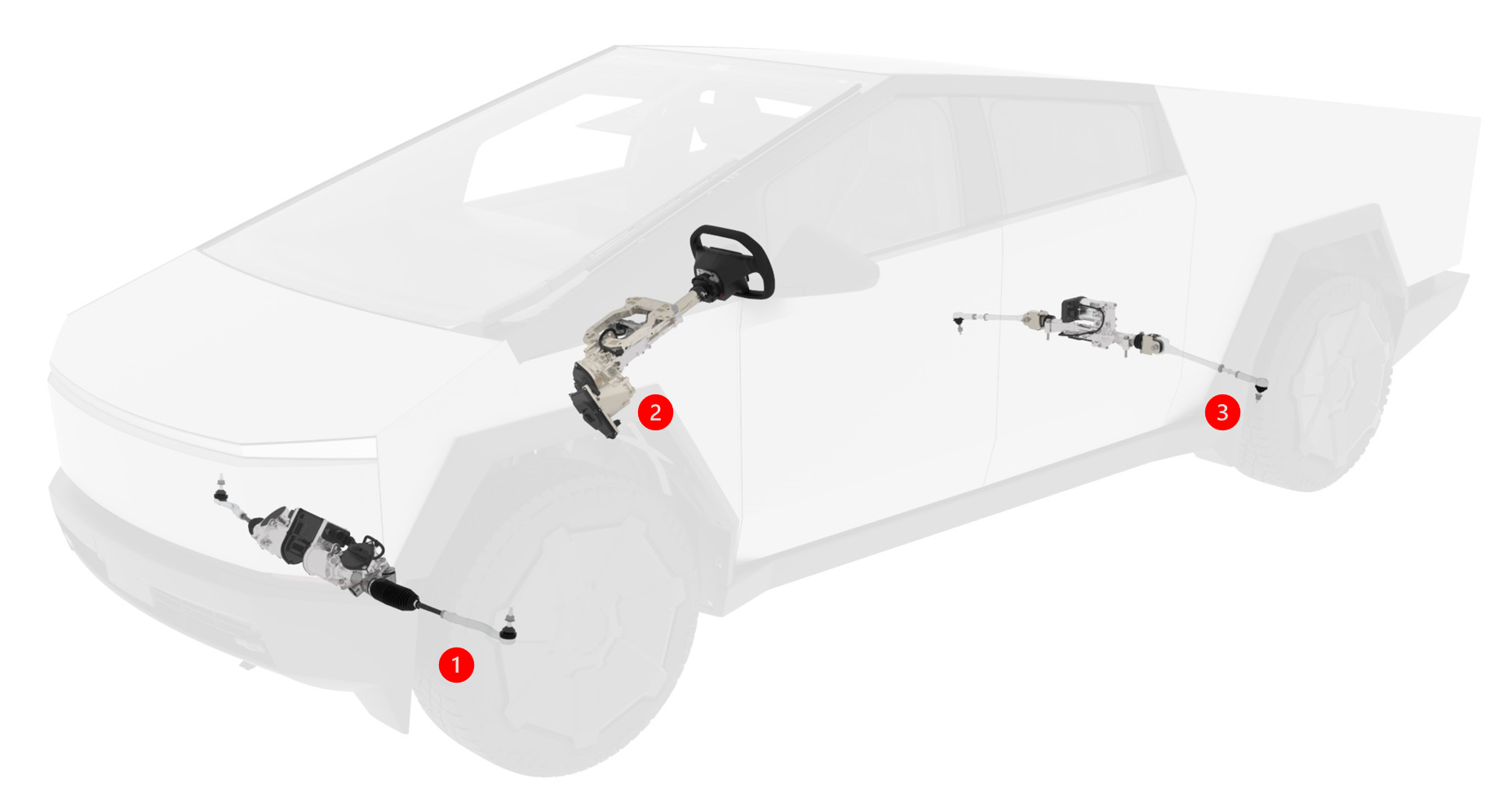 Cybertruck features a Steer-by-Wire (SbW) system that eliminates the intermediate shaft used to steer in traditional automotive designs. There is no mechanical linkage between the steering wheel and road wheels.