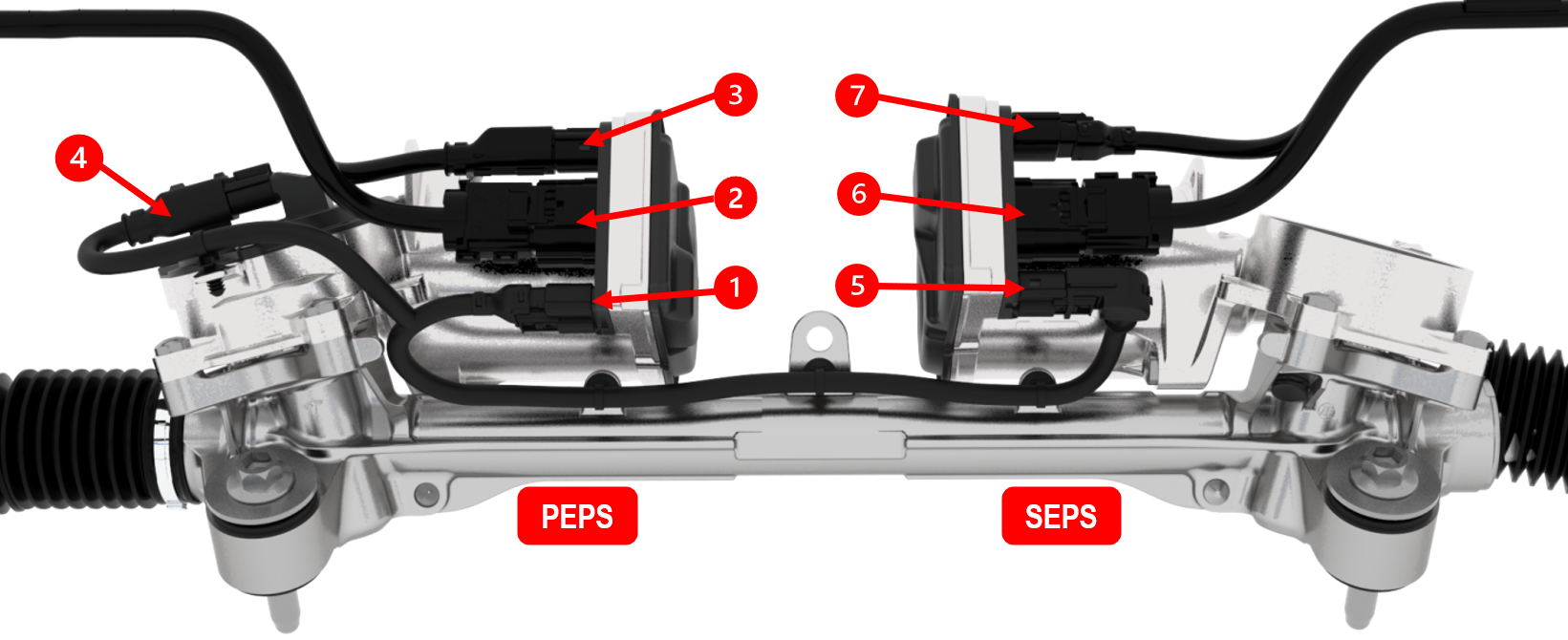 | 1. PEPS RACK CAN - (Private) - X0441 2. PEPS LEFT CAN (Public) and PEPS Power - X0442 3. PEPS SHAFT CAN P (Private) - X0440 4. Pinion Angle Sensor (SENT) and Pinion Angle Sensor Power - X0443 5. SEPS RACK CAN - (Private) - X0446 6. SEPS RIGHT CAN (Public) and SEPS Power - X0437 7. SEPS SHAFT CAN S (Private) - X0432 |