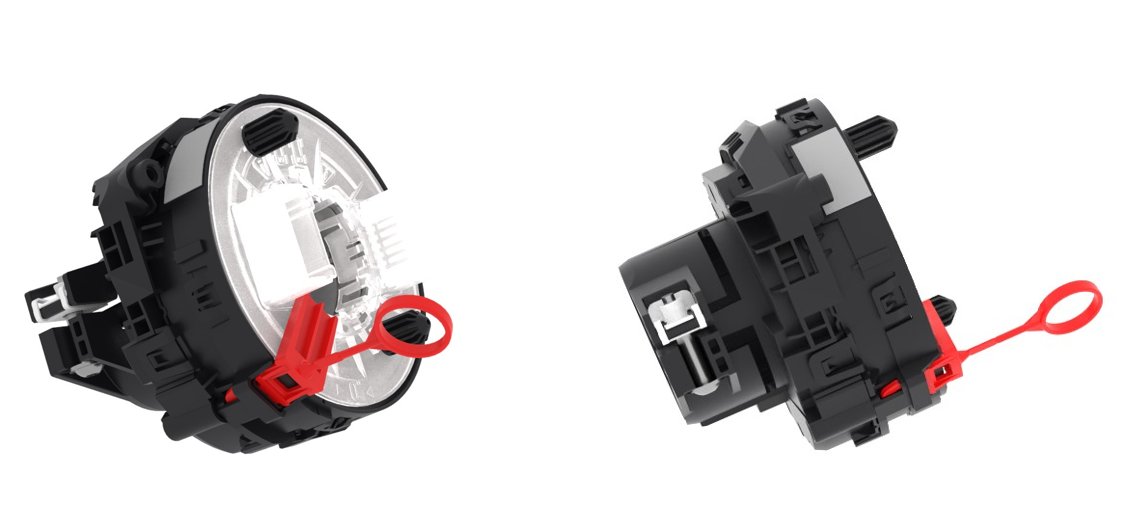 The SCCM features a steering angle sensor, and a clock spring that pass through LIN communication and power to driver airbag, the steering wheel controls, and heater mat. As the steering wheel rotates the SCCM, the clock spring maintains electrical continuity for the pass-through connections. The SCCM angle sensor and steering wheel are powered by and communicate with the Left Vehicle Controller (VCLEFT). The steering column ships from the supplier with a delivery lock pin to prevent clock spring damage by over rotation, it is removed before the steering wheel is installed.