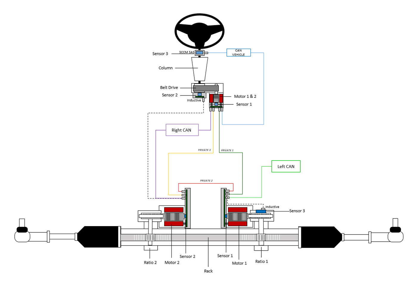 Both of the actuators operate simultaneously. The torque is delivered to the gearboxes which turn the pinion gears and result in lateral motion of the rack bar. When the rack bar moves laterally, the tie rods that connect the rack bar to the front knuckles will follow the same path and move the front road wheels left and right.