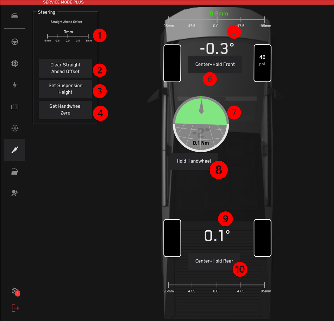 | 1. Indicates Current Straight Ahead Offset 2. Clears Straight Ahead Offset 3. Air Suspension Leveling Commands 4. Calibrates the Handwheel Center 5. Front Rack Position (Top) and Road Wheel Angle (Bottom) 6. Hold Front Rack Center 7. Indicates Steering Wheel Angle (PSFA_handwheelrotation) 8. Holds Steering Wheel Center 9. Rear Road Wheel Angle (Top) and Rear Rack Position (Bottom Slider) 10. Holds and Disables Rear Steering Actuator |