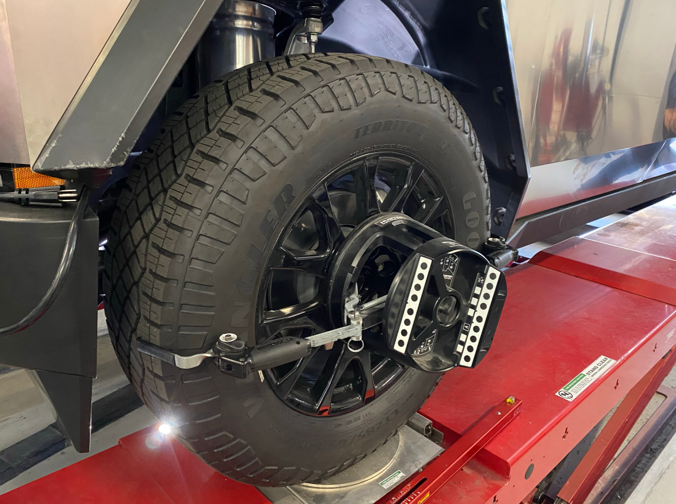The Cybertruck is aligned by adjusting the front and rear toe angles only. There are no camber or caster adjustments. The air suspension ride height setting during wheel alignment is medium height. Tire pressures must be checked prior to alignment.