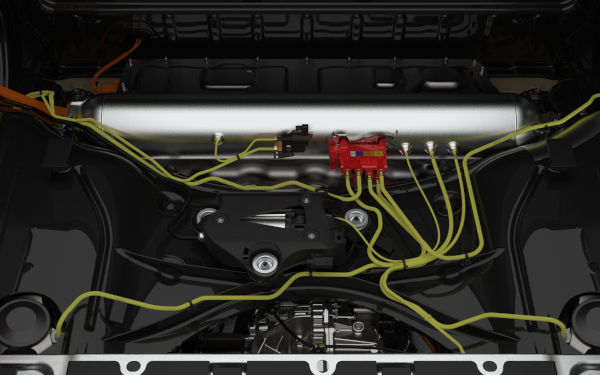 The valve directly connects the air reservoir and the battery pack ancillary volume. It controls the flow of pressurized air into the HV pack as a method of active water ingress protection when the vehicle wades through water with the pack submerged. The Pressurized Pack valve block has two fittings, with one air line to the air reservoir and the other to the pyro hatch cover. The valve block has a color-coded label that matches colors on the air lines to encourage correct insertion.